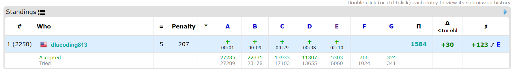 I hurried to my gym class. I got WA (wrong answer) on test 1 twice, because I had missed a single number. I fidgeted around with the initial bounds and answers and prayed for an AC. Thank the Lord because I actually did get the accepted verdict four minutes before the contest ended. What a clutch!