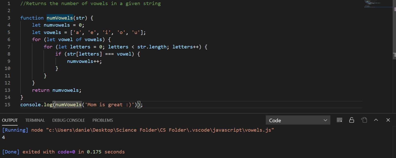 Today I’ve implemented another program on VS Code Javascript – a function that returns the number of vowels in a given string! 😅